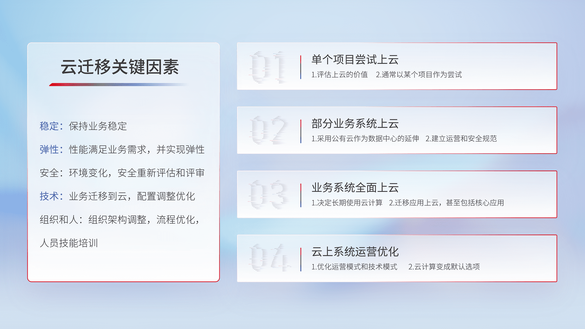 结合实际业务,,,从规划设计、、、、云平台选型、、、云原生改造、、数据迁移、、、集成交付,,,,迁移全过程为客户识别最佳上云路径,,做好风险识别管理,,设计网络架构、、、、身份权限、、安全审计合规、、、、操作审计、、日志审计、、、、监控告警策略、、多站点容灾设计等,,,对云上基础设施进行整体规划,,,,提升IT治理水平,,,以满足弹性、、、高可用、、、、高性能的需求。。。。