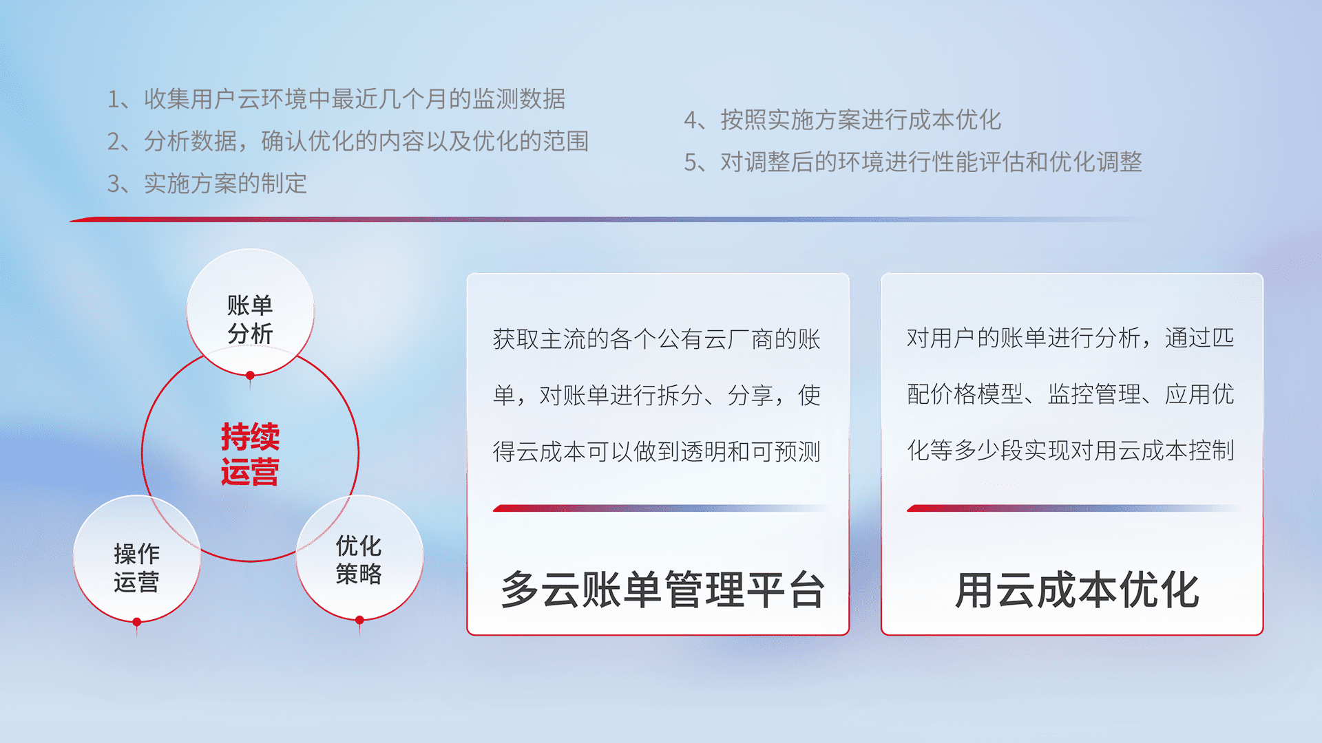 通过多云纳管,,以统一的资源数据模型把客户的云资源进行抽象和封装,,,进而实现对多云资源的统一操作,,保障云资源管理的可靠性、、稳定性与可用性。。。。量身定制化运维内容,,,,配置、、、、开发运维、、、补丁管理、、、、备份、、、、监控、、认证和访问管理、、审计和日常巡检等,,,保障在用云过程中的可靠度,,,,稳定度以及高可用率。。。。